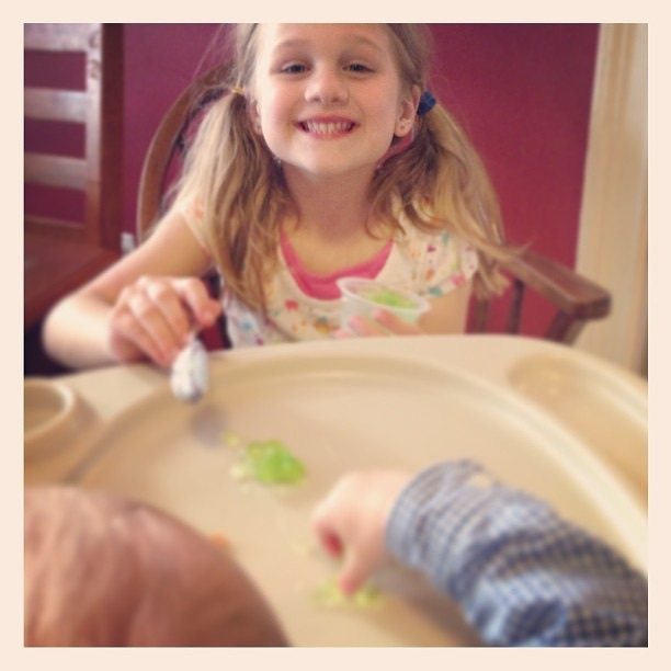 Big sis feeding little brother.