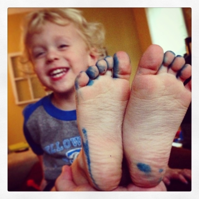 Someone traced his feet with a blue marker.
