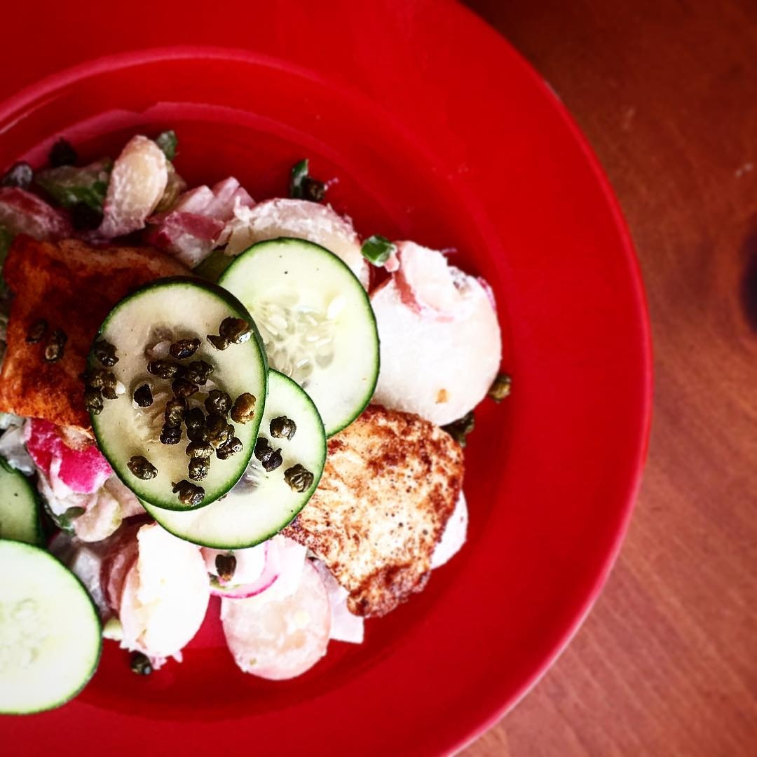 Our first #blueapron meal. Seared cod and potato salad. Tasty.