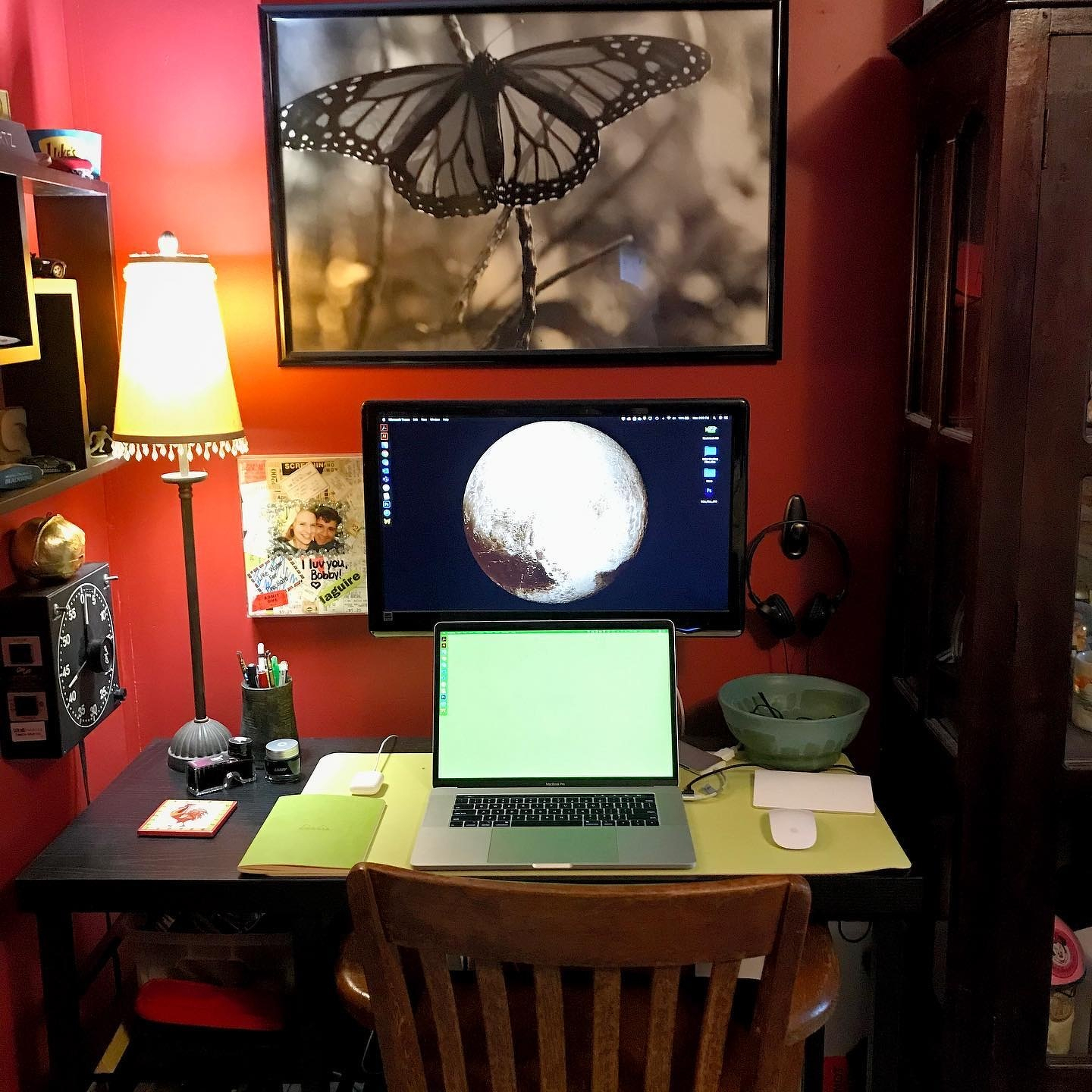 The current state of my home office. Added a couple of things to the mix… a desk pad, some wired over the ear headphones, my old darkroom timer… I imagine in a couple of weeks, it well look different.
