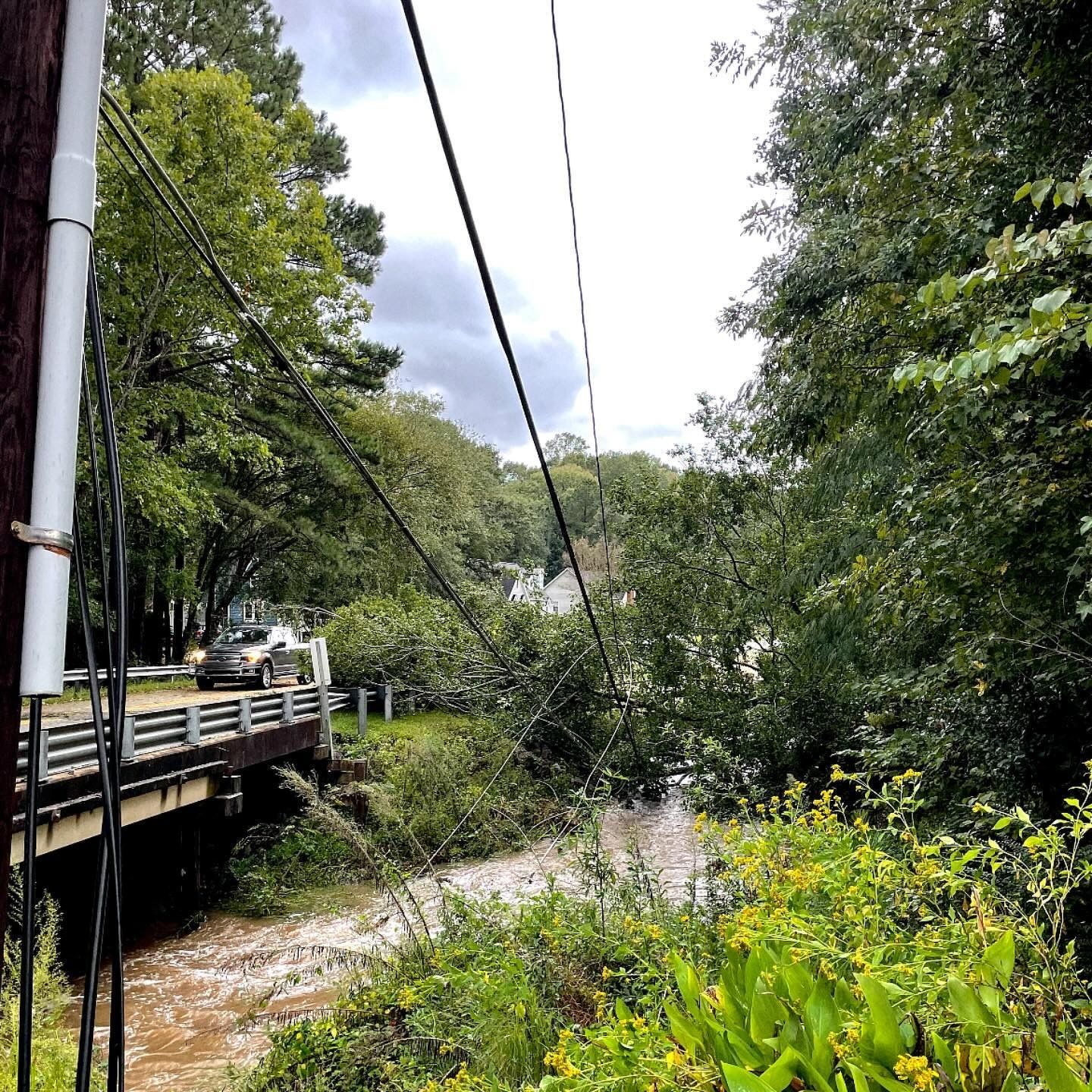 Tree at the front of our neighborhood fell into the creek and took the power lines with it. Dominion has cleared enough so we can leave the neighborhood if we need to, but itâs going to be a while before we have power.